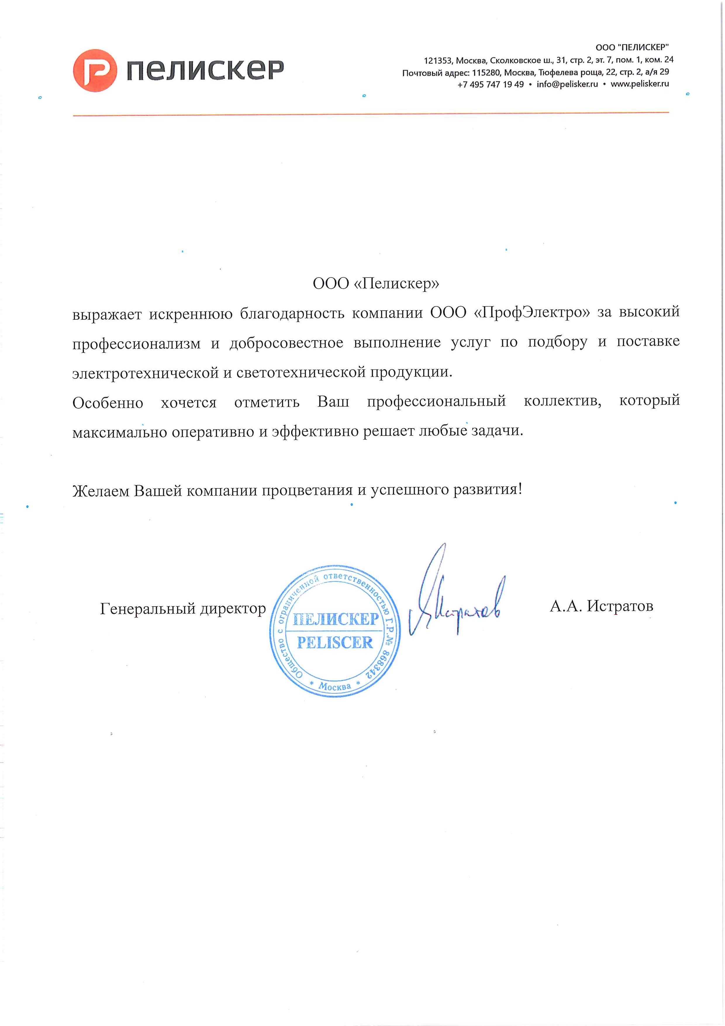 АО ГНЦ Центр Келдыша хочет отметить четкую и безупречную работу Профэлектро в вопросах поставки электротехнической продукции. Менеджеры компании всегда готовы предложить качественные альтернативы продукции вышедшей из производства или с долгим сроком поставки, что позволяет выполнить гособоронз...аказ в срок. Желаем дальнейшего процветания компании и взаимного сотрудничества!