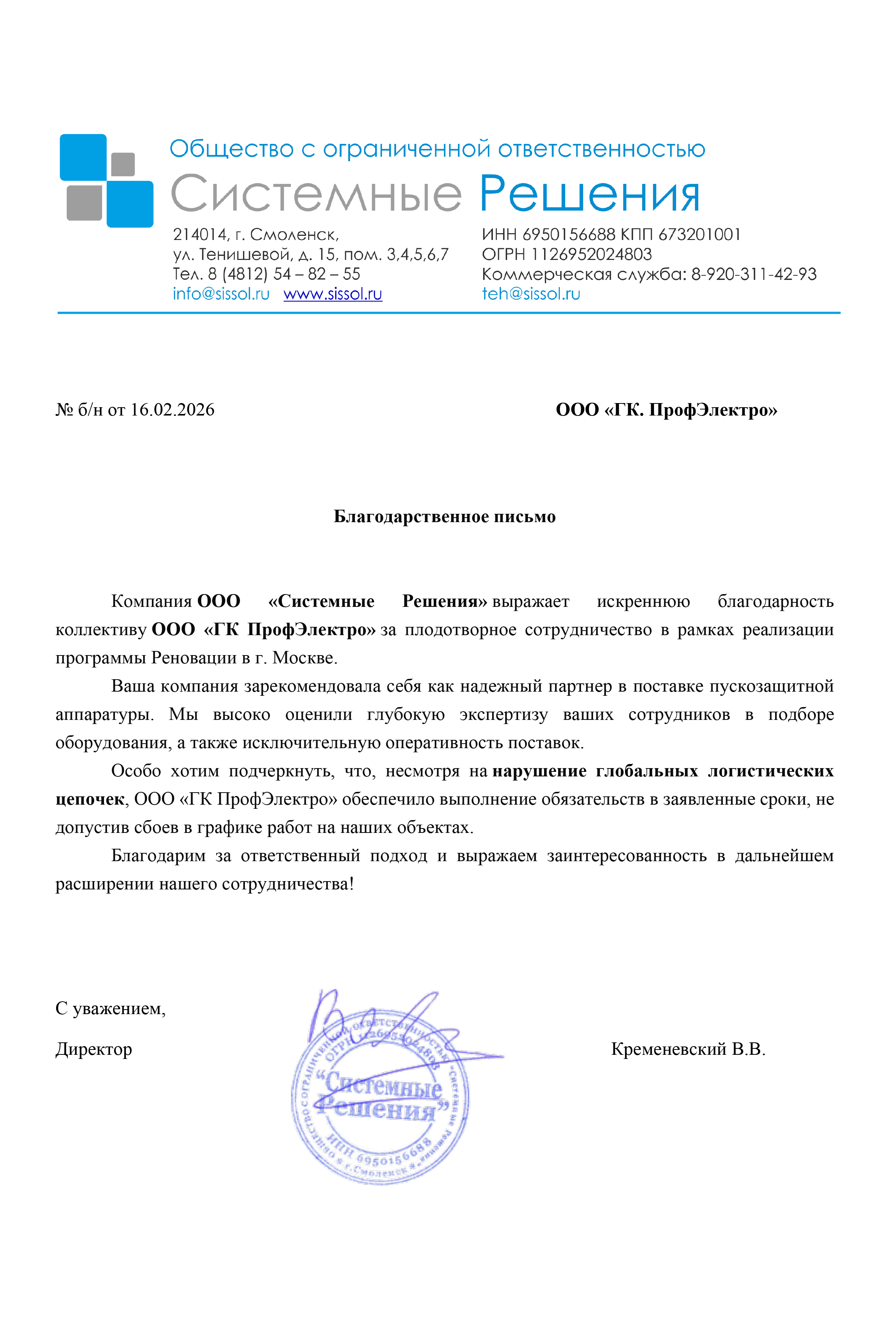 Мы высоко ценим вашу надежность как партнера, которая в первую очередь проявляется в своевременности и точности поставок электрооборудования. Это позволяет нам соблю...дать собственные производственные планы и графики, что крайне важно в условиях современного рынка.