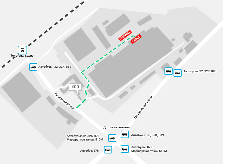 - От метро Рассказовка: на автобусе 750 до станции "Толстопальцево", далее далее ~ 600м пешком по ул. Советская, слева будет КПП.