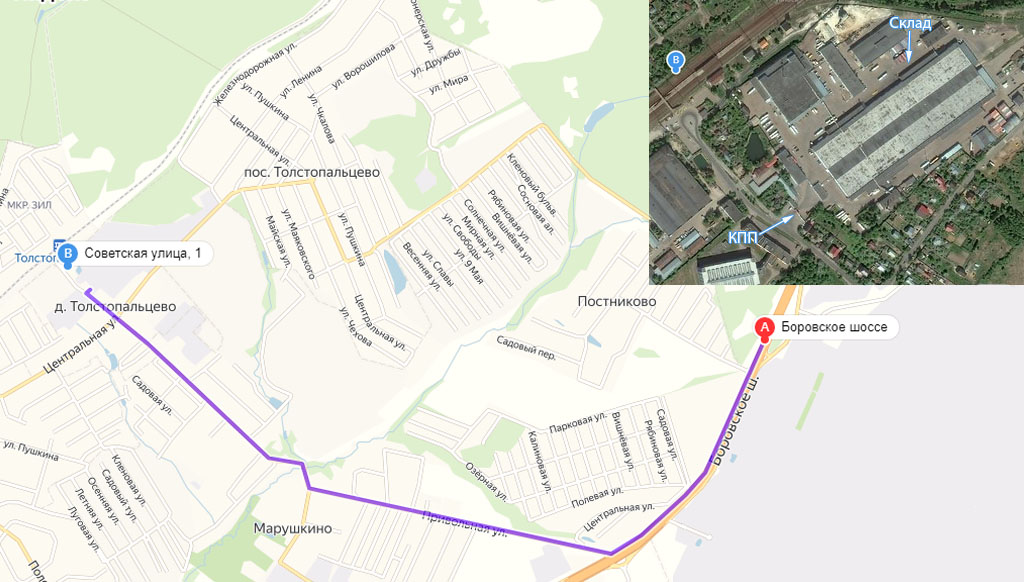 - Двигаясь из центра, с Боровского шоссе повернуть на ул. Привольную, продолжать движение прямо до ул. Советской, после пересечения ул. Советской с ул. Центральной, двигаться ещё ~190м., справа будет КПП.